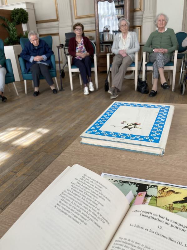 Dans une atmosphère conviviale et participative, Isabelle et Philippe ont proposé une lecture vivante, en se donnant la réplique, de plusieurs fables, connues et moins connues. Parmi elles : Le Coq et le Renard, Le Rat des villes et le Rat des champs, Le Pêcheur et le Petit Poisson ou encore Le Lion et l’Huître. Chaque lecture a donné lieu à un temps d’échange, permettant aux résidents de partager leurs interprétations et de discuter ensemble des morales, toujours actuelles, de ces récits.