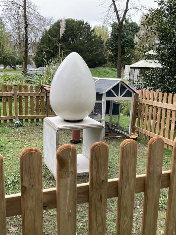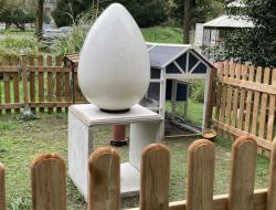 À l’aube des fêtes de Pâques, une surprise de taille est venue égayer notre quotidien… Une magnifique sculpture en forme d’œuf a fait son apparition dans le poulailler !